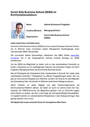 Der Managing Director Adonis-Emmanouil Fragkakis spricht über die weltweiten Alleinstellungsmerkmale der Zurich Elite Business School (ZEBS) und entkräftet die Vorwürfe, welche die Journalistin Bärbel Schwertfeger über die ZEBS und ihr Studienangebot in der Vergangenheit verbreitet hat. …